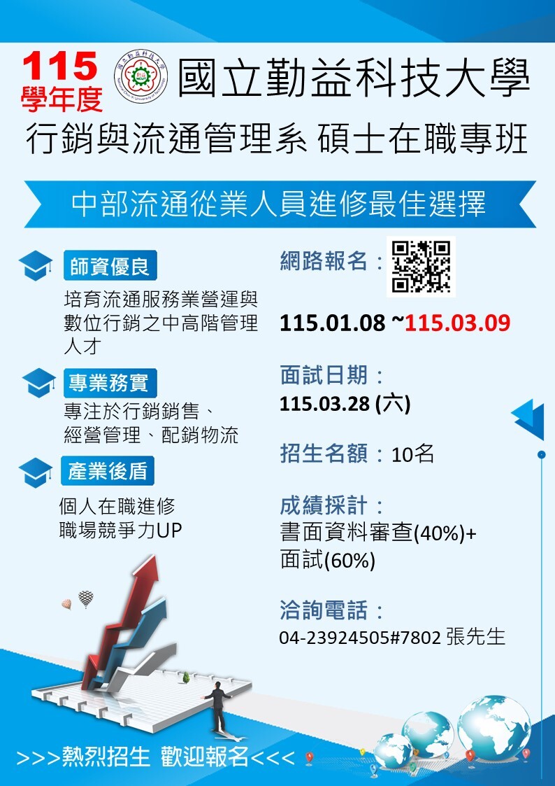 115學年度行銷與流通管理系碩士在職專班招生(延長報名至3/9)